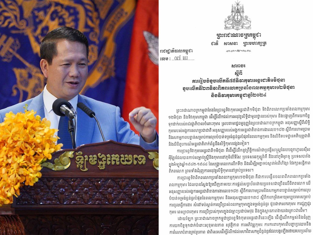រាជរដ្ឋាភិបាលកម្ពុជាចេញសារាចរណែនាំការរៀបចំខួបលើទី៧៥ទិវាកុមារអន្តរជាតិ១មិថុនា ខួបលើកទី២៣ទិវាពិភពលោកប្រឆាំងពលកម្មកុមារ១២មិថុនា និងទិវាកុមារកម្ពុជាឆ្នាំ២០២៤
